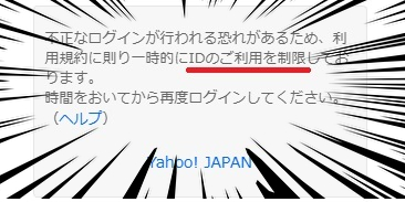 「不正なログインが行われる恐れがあるため、利用規約に則り一時的にIDのご利用を制限しております。